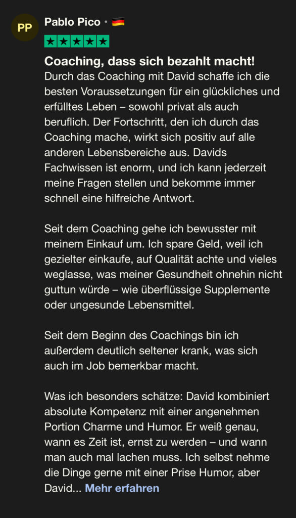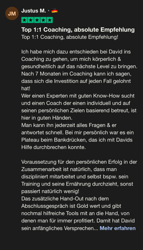 Seit Anwendung dieses Systems habe ich mehr Energie trotz geringerem Schlafbedarf. Ich bin endlich vollständig schmerzfrei und konnte in einem Jahr 10kg Muskelmasse aufbauen sowie in 8 Monaten 20kg Körperfett verlieren.